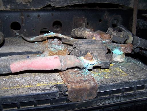 The reason I bring this picture to your attention is because many fleets have their vehicles inspected via D.O.T. standards. Nowhere on the federal motor carrier annual vehicle inspection form does it refer to battery condition. Yet this could have easily caused a fire or explosion. The wire illustrated above was a positive wire and it conducted enough energy through the plastic housing of the battery to cause such an arch that it melted a hole through the top of the battery. Had this vehicle been properly maintained, this would have been addressed far before the wires turned green, let alone melted the battery. I'm not blaming the customer here they have been paying a reputable local business to perform their maintenance. Unfortunately they were not getting their moneys worth. |